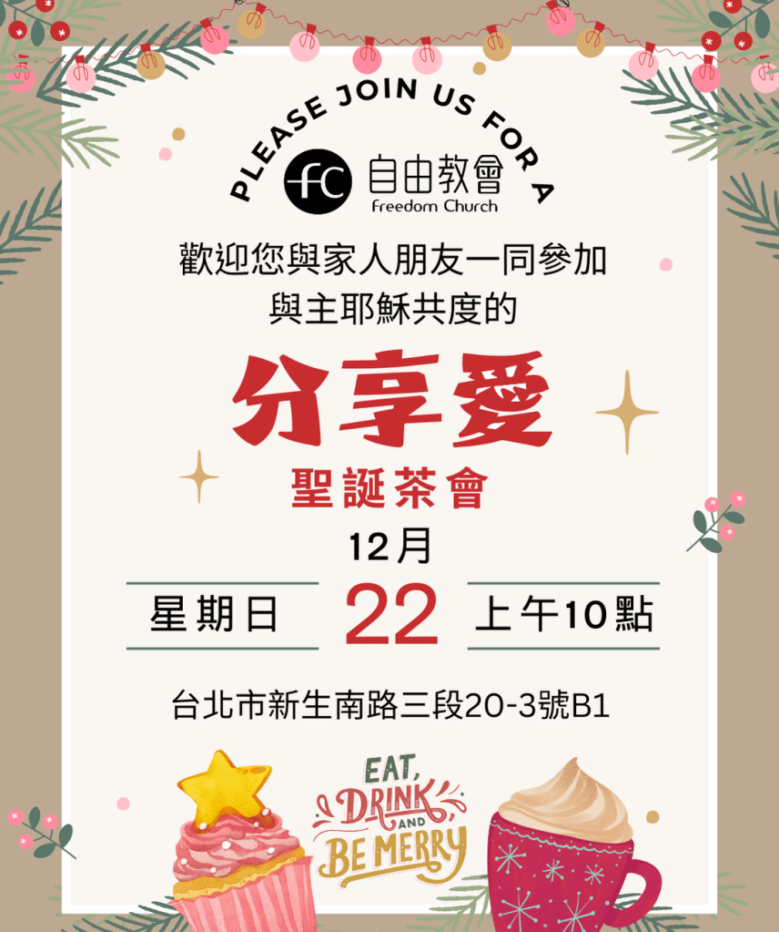 教會活動 邀請您參加分享愛聖誕節茶會 分類: freedomchurchtw 於 2024-11-182025-02-08 親愛的朋友們, 在這美好的聖誕季節,我們誠摯邀請您參加分享愛聖誕節茶會 這將是一個充滿愛與喜樂的時光,我們將準備美味的茶點、甜點,還有聖誕頌歌和特別節目。此外,我們會分享關於耶穌帶來的盼望與恩典。 請攜帶您的家人和朋友,一起來感受這節日的歡樂,並在這個特別的時刻彼此祝福。 讓我們在這聖誕佳節中,透過愛與分享,讓主的平安與喜樂充滿我們的生命。 日期:2024/12/22 時間:上午十時至中午十二時 地點:台北市新生南路三段 20-3 號 B1 期待與您相聚, 主耶穌的愛與祝福與您同在。 分享此文: Share on LINE 分享(在新視窗中開啟) LINE 分享 分享到 WhatsApp(在新視窗中開啟) WhatsApp Email a link to a friend(在新視窗中開啟) 電子郵件 喜歡 正在載入... 相關